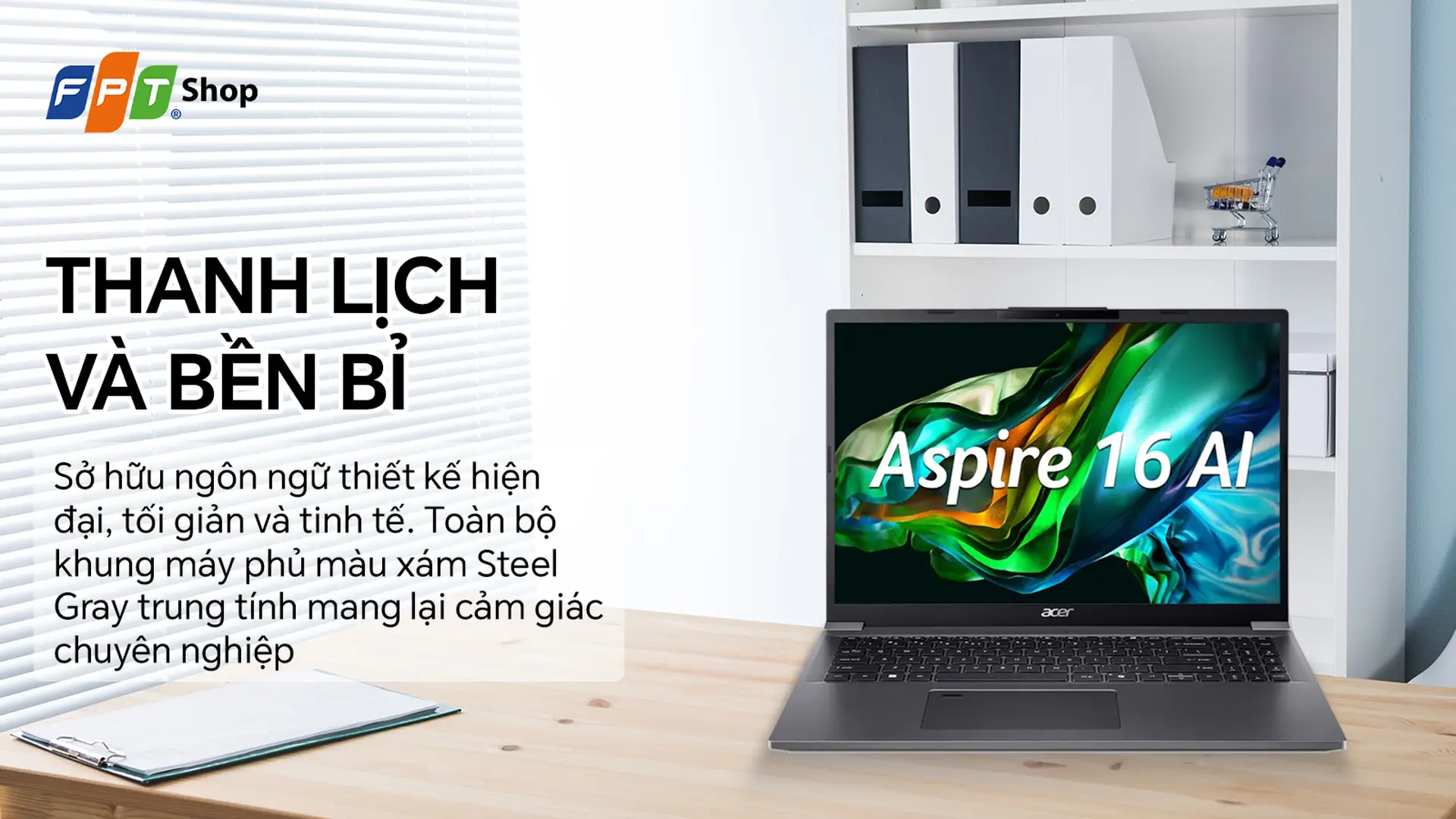 Laptop Acer Aspire 16 AI A16-71M-71U7 màn hình 16:10 chuẩn FHD+, trọng lượng chỉ 1.64 kg, sức mạnh AI ấn tượng từ Intel Core Ultra 7 155H. Đặt ngay giá tốt nhất!