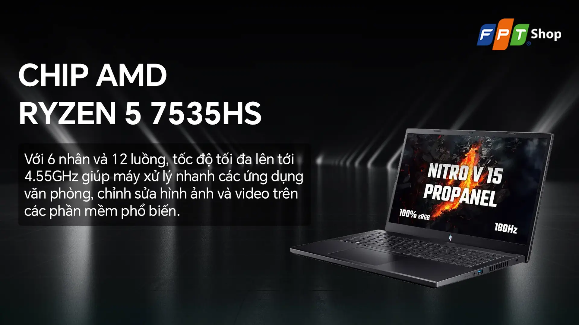 Laptop Acer Nitro V 15 ProPanel ANV15-41-R7AP (Ryzen 5-7535HS/16GB/512GB/RTX2050/15.6") hiệu năng tốt, đa nhiệm ấn tượng, chơi game ổn. Đặt mua giá rẻ tại FPT Shop!