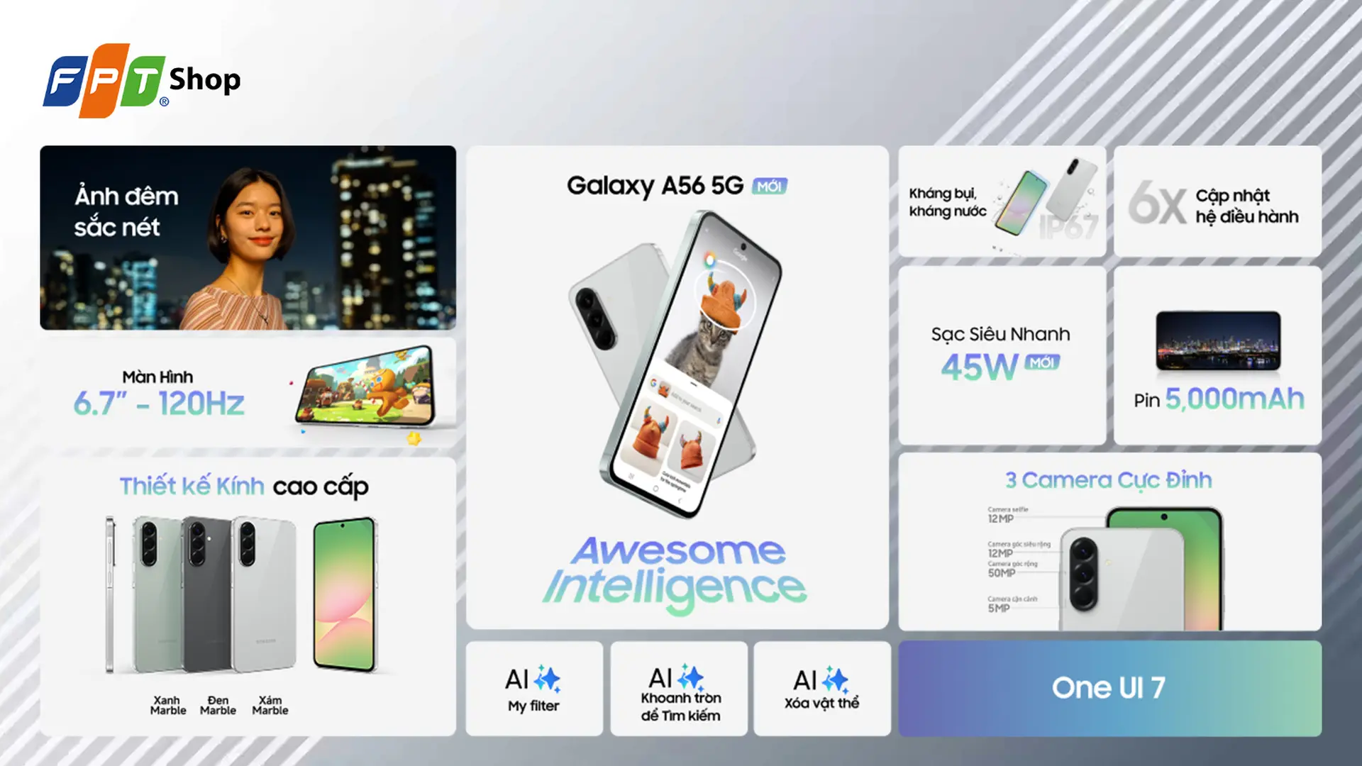 Điện thoại Samsung Galaxy A56 5G 8GB/128GB chính hãng, giá rẻ, trả góp 0% với nhiều quà tặng hấp dẫn, thiết kế mới cùng hiệu năng cực đỉnh. Hỗ trợ bảo hành lên đến 12 tháng, giao hàng miễn phí toàn quốc. Đặt mua Samsung A56 ngay tại FPT Shop!